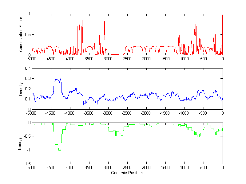 The energy profile (green curve) is about energy for module detection based on TF interaction. The positions with energy less than -1 indicate the existence of CRMs.