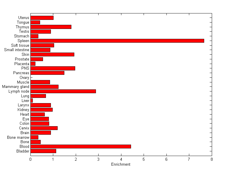The expression level is normalized with tissue-library size. Each value for a gene in a tissue is a ratio of observed ESTs to the expected one in this tissue. The expected number of ESTs is the product of total ESTs of the gene and the fraction of total ESTs in the tissue among all ESTs in 30 tissues.