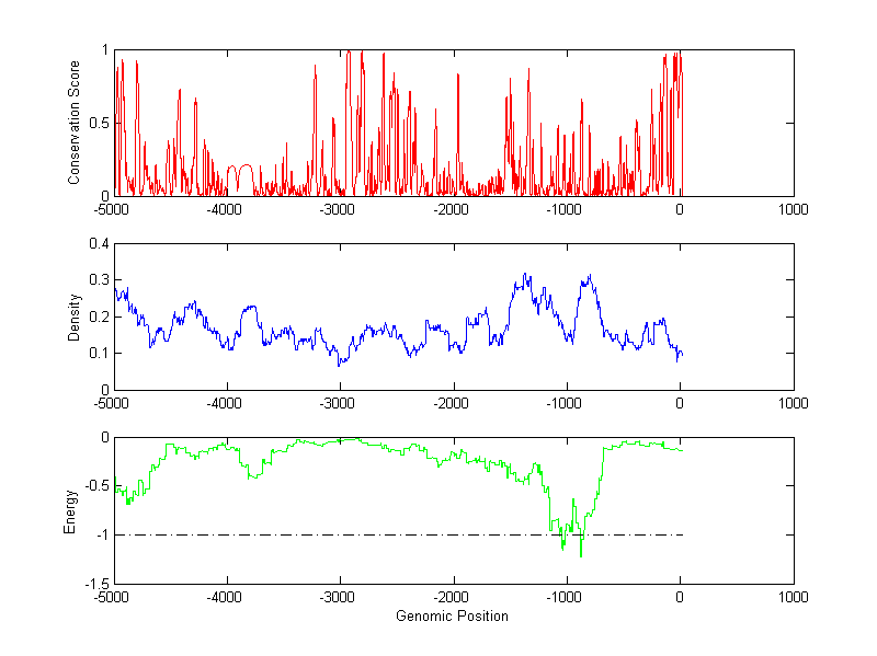 The energy profile (green curve) is about energy for module detection based on TF interaction. The positions with energy less than -1 indicate the existence of CRMs.