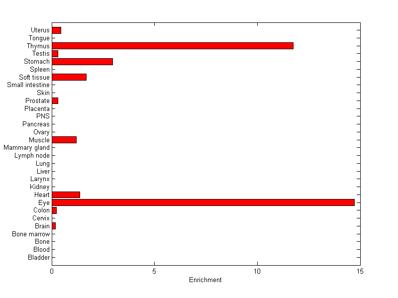 The expression level is normalized with tissue-library size. Each value for a gene in a tissue is a ratio of observed ESTs to the expected one in this tissue. The expected number of ESTs is the product of total ESTs of the gene and the fraction of total ESTs in the tissue among all ESTs in 30 tissues.
