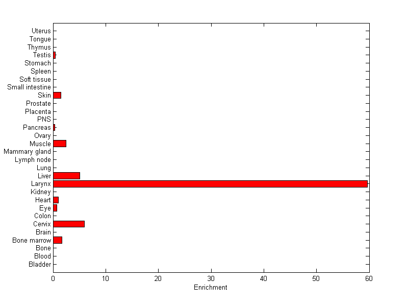 About the profile: The expression level is normalized with tissue-library size. Each value for a gene in a tissue is a ratio of observed ESTs to the expected one in this tissue. The expected number of ESTs is the product of total ESTs of the gene and the fraction of total ESTs in the tissue among all ESTs in 30 tissues. Summary: This gene is preferentially expressed in [larynx, liver] Download: |