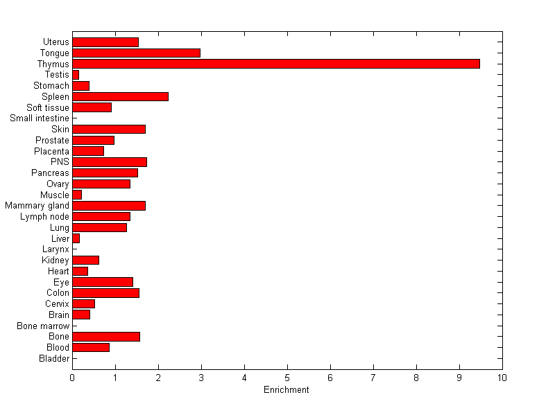 The expression level is normalized with tissue-library size. Each value for a gene in a tissue is a ratio of observed ESTs to the expected one in this tissue. The expected number of ESTs is the product of total ESTs of the gene and the fraction of total ESTs in the tissue among all ESTs in 30 tissues.
