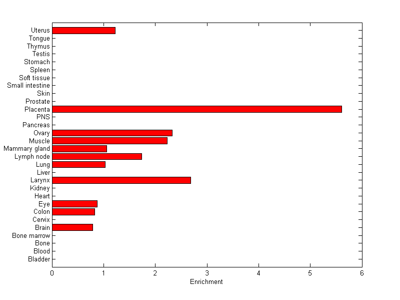 The expression level is normalized with tissue-library size. Each value for a gene in a tissue is a ratio of observed ESTs to the expected one in this tissue. The expected number of ESTs is the product of total ESTs of the gene and the fraction of total ESTs in the tissue among all ESTs in 30 tissues.