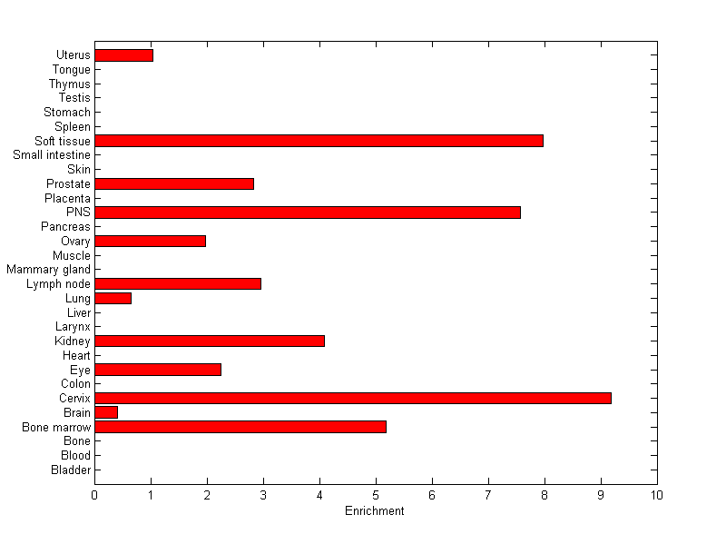 The expression level is normalized with tissue-library size. Each value for a gene in a tissue is a ratio of observed ESTs to the expected one in this tissue. The expected number of ESTs is the product of total ESTs of the gene and the fraction of total ESTs in the tissue among all ESTs in 30 tissues.