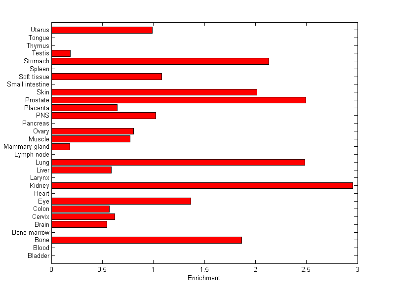 The expression level is normalized with tissue-library size. Each value for a gene in a tissue is a ratio of observed ESTs to the expected one in this tissue. The expected number of ESTs is the product of total ESTs of the gene and the fraction of total ESTs in the tissue among all ESTs in 30 tissues.