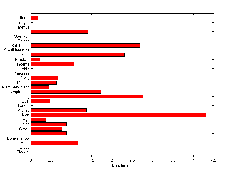 The expression level is normalized with tissue-library size. Each value for a gene in a tissue is a ratio of observed ESTs to the expected one in this tissue. The expected number of ESTs is the product of total ESTs of the gene and the fraction of total ESTs in the tissue among all ESTs in 30 tissues.
