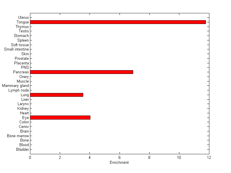 The expression level is normalized with tissue-library size. Each value for a gene in a tissue is a ratio of observed ESTs to the expected one in this tissue. The expected number of ESTs is the product of total ESTs of the gene and the fraction of total ESTs in the tissue among all ESTs in 30 tissues.