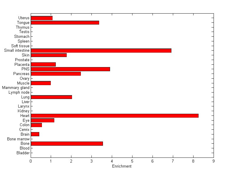 About the profile: The expression level is normalized with tissue-library size. Each value for a gene in a tissue is a ratio of observed ESTs to the expected one in this tissue. The expected number of ESTs is the product of total ESTs of the gene and the fraction of total ESTs in the tissue among all ESTs in 30 tissues. Summary: This gene is preferentially expressed in [heart] Download: |