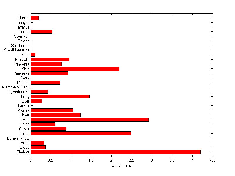 The expression level is normalized with tissue-library size. Each value for a gene in a tissue is a ratio of observed ESTs to the expected one in this tissue. The expected number of ESTs is the product of total ESTs of the gene and the fraction of total ESTs in the tissue among all ESTs in 30 tissues.