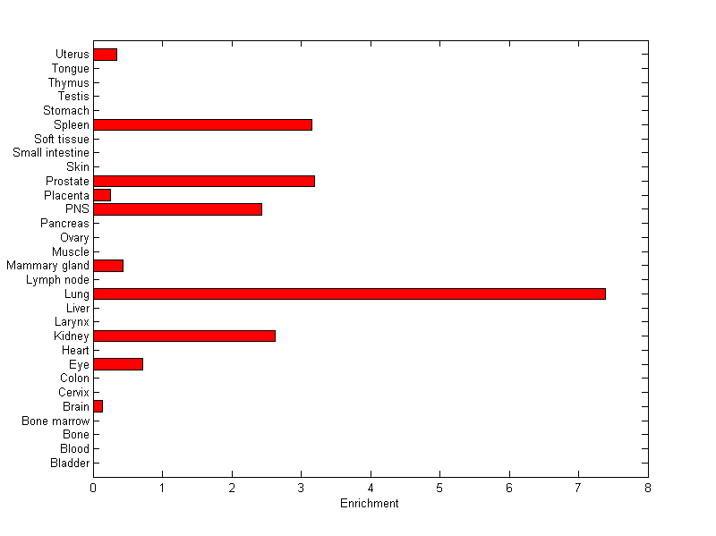 The expression level is normalized with tissue-library size. Each value for a gene in a tissue is a ratio of observed ESTs to the expected one in this tissue. The expected number of ESTs is the product of total ESTs of the gene and the fraction of total ESTs in the tissue among all ESTs in 30 tissues.