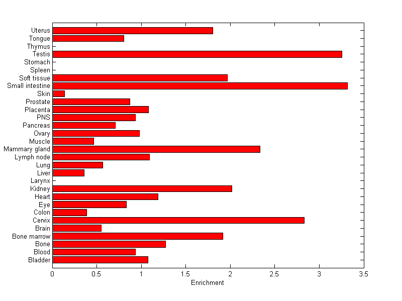 The expression level is normalized with tissue-library size. Each value for a gene in a tissue is a ratio of observed ESTs to the expected one in this tissue. The expected number of ESTs is the product of total ESTs of the gene and the fraction of total ESTs in the tissue among all ESTs in 30 tissues.