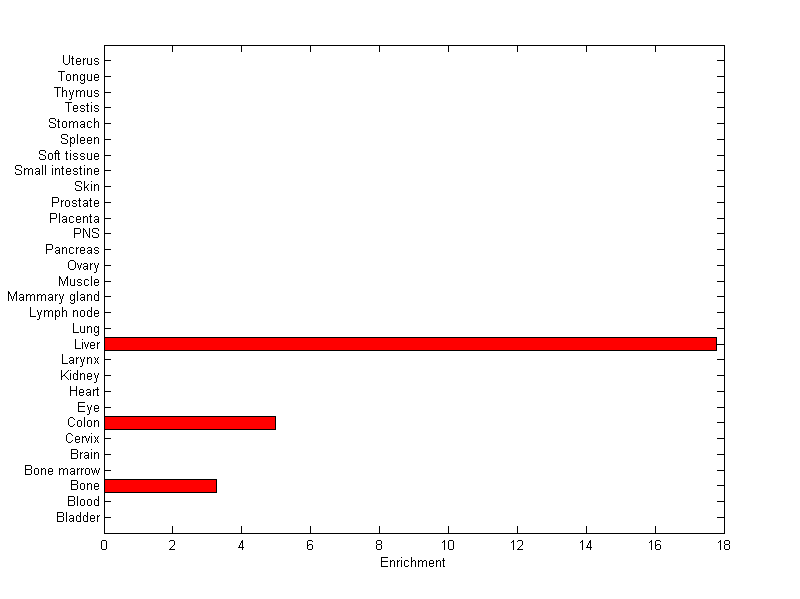 The expression level is normalized with tissue-library size. Each value for a gene in a tissue is a ratio of observed ESTs to the expected one in this tissue. The expected number of ESTs is the product of total ESTs of the gene and the fraction of total ESTs in the tissue among all ESTs in 30 tissues.