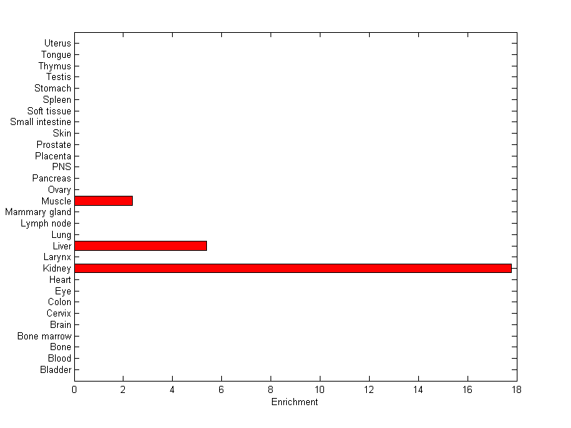 The expression level is normalized with tissue-library size. Each value for a gene in a tissue is a ratio of observed ESTs to the expected one in this tissue. The expected number of ESTs is the product of total ESTs of the gene and the fraction of total ESTs in the tissue among all ESTs in 30 tissues.