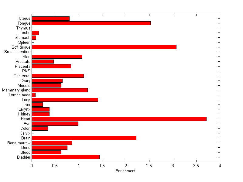 The expression level is normalized with tissue-library size. Each value for a gene in a tissue is a ratio of observed ESTs to the expected one in this tissue. The expected number of ESTs is the product of total ESTs of the gene and the fraction of total ESTs in the tissue among all ESTs in 30 tissues.