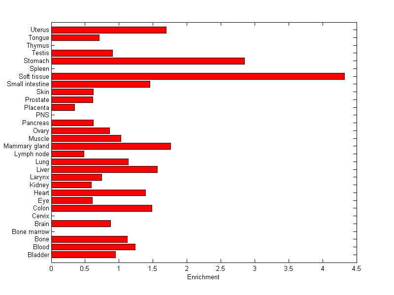 The expression level is normalized with tissue-library size. Each value for a gene in a tissue is a ratio of observed ESTs to the expected one in this tissue. The expected number of ESTs is the product of total ESTs of the gene and the fraction of total ESTs in the tissue among all ESTs in 30 tissues.