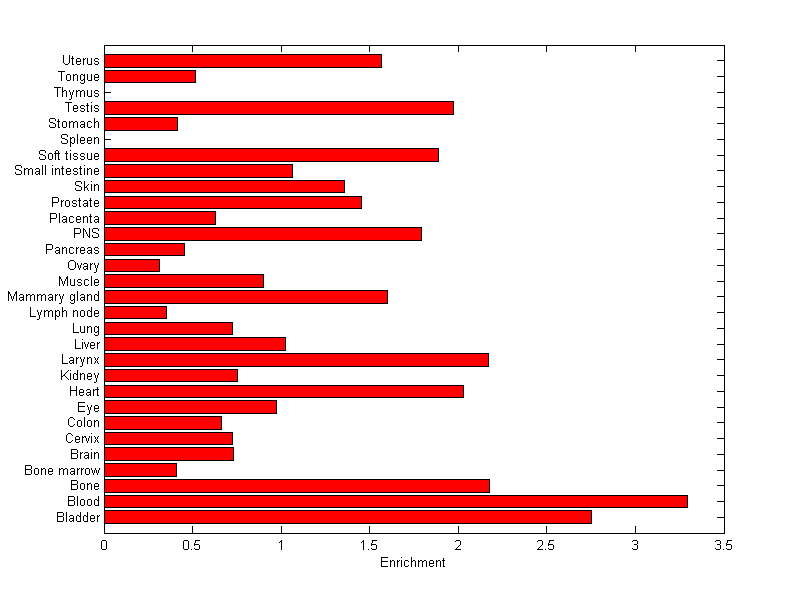 The expression level is normalized with tissue-library size. Each value for a gene in a tissue is a ratio of observed ESTs to the expected one in this tissue. The expected number of ESTs is the product of total ESTs of the gene and the fraction of total ESTs in the tissue among all ESTs in 30 tissues.