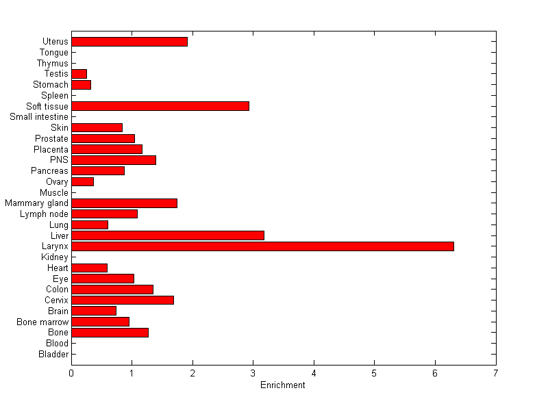 The expression level is normalized with tissue-library size. Each value for a gene in a tissue is a ratio of observed ESTs to the expected one in this tissue. The expected number of ESTs is the product of total ESTs of the gene and the fraction of total ESTs in the tissue among all ESTs in 30 tissues.