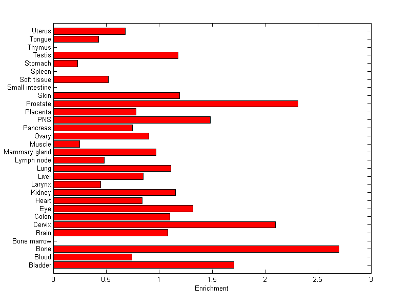 The expression level is normalized with tissue-library size. Each value for a gene in a tissue is a ratio of observed ESTs to the expected one in this tissue. The expected number of ESTs is the product of total ESTs of the gene and the fraction of total ESTs in the tissue among all ESTs in 30 tissues.