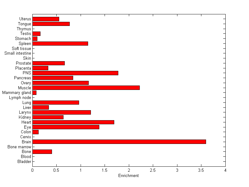 The expression level is normalized with tissue-library size. Each value for a gene in a tissue is a ratio of observed ESTs to the expected one in this tissue. The expected number of ESTs is the product of total ESTs of the gene and the fraction of total ESTs in the tissue among all ESTs in 30 tissues.