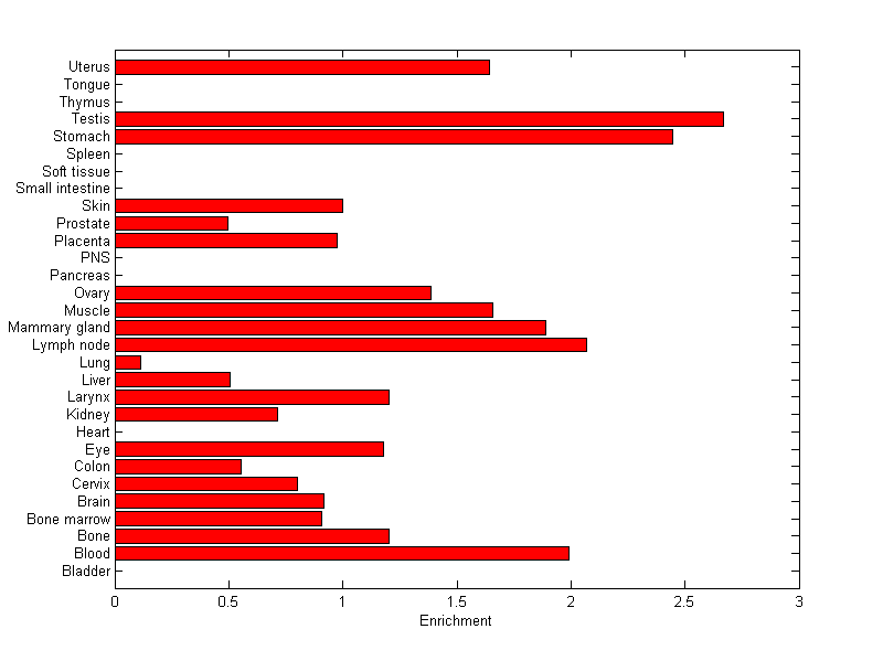 The expression level is normalized with tissue-library size. Each value for a gene in a tissue is a ratio of observed ESTs to the expected one in this tissue. The expected number of ESTs is the product of total ESTs of the gene and the fraction of total ESTs in the tissue among all ESTs in 30 tissues.