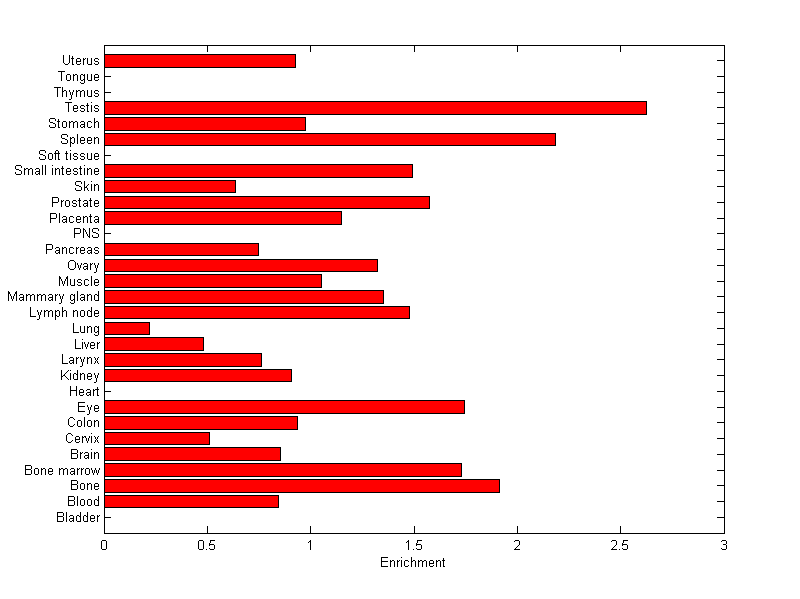 The expression level is normalized with tissue-library size. Each value for a gene in a tissue is a ratio of observed ESTs to the expected one in this tissue. The expected number of ESTs is the product of total ESTs of the gene and the fraction of total ESTs in the tissue among all ESTs in 30 tissues.