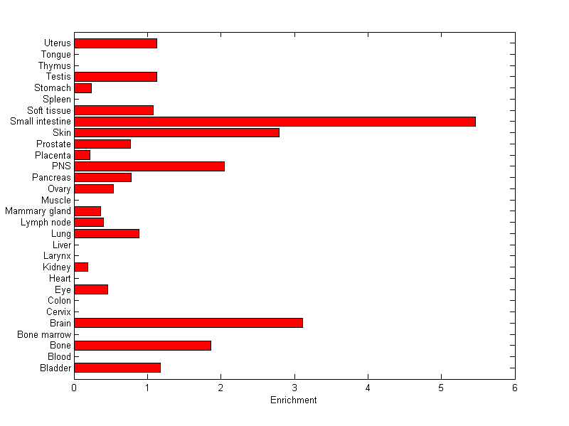 The expression level is normalized with tissue-library size. Each value for a gene in a tissue is a ratio of observed ESTs to the expected one in this tissue. The expected number of ESTs is the product of total ESTs of the gene and the fraction of total ESTs in the tissue among all ESTs in 30 tissues.