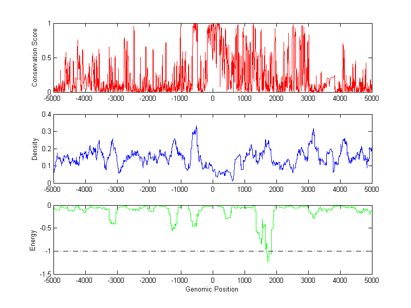 The energy profile (green curve) is about energy for module detection based on TF interaction. The positions with energy less than -1 indicate the existence of CRMs.