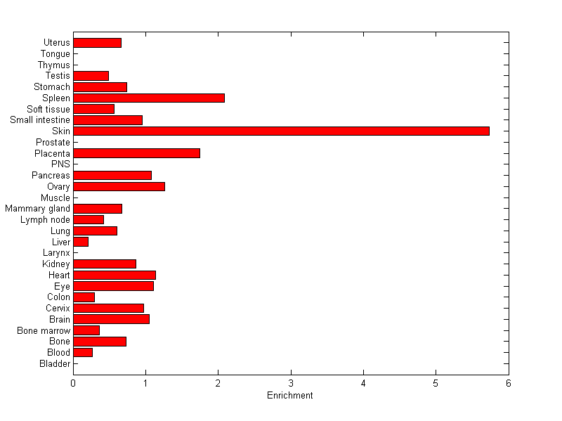 The expression level is normalized with tissue-library size. Each value for a gene in a tissue is a ratio of observed ESTs to the expected one in this tissue. The expected number of ESTs is the product of total ESTs of the gene and the fraction of total ESTs in the tissue among all ESTs in 30 tissues.