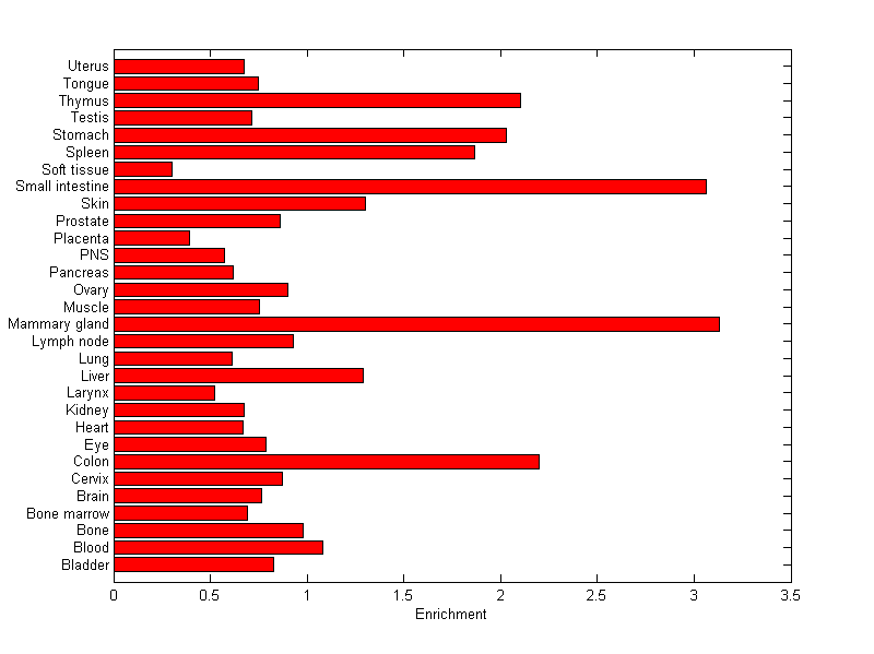 The expression level is normalized with tissue-library size. Each value for a gene in a tissue is a ratio of observed ESTs to the expected one in this tissue. The expected number of ESTs is the product of total ESTs of the gene and the fraction of total ESTs in the tissue among all ESTs in 30 tissues.