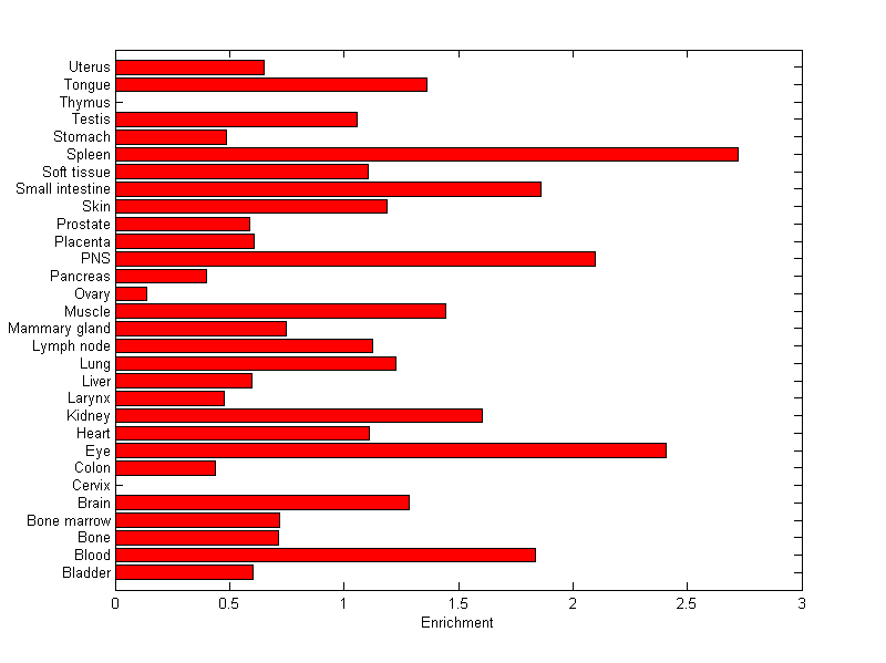 The expression level is normalized with tissue-library size. Each value for a gene in a tissue is a ratio of observed ESTs to the expected one in this tissue. The expected number of ESTs is the product of total ESTs of the gene and the fraction of total ESTs in the tissue among all ESTs in 30 tissues.