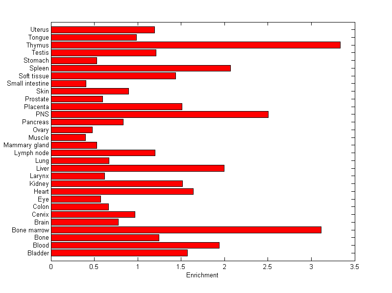 The expression level is normalized with tissue-library size. Each value for a gene in a tissue is a ratio of observed ESTs to the expected one in this tissue. The expected number of ESTs is the product of total ESTs of the gene and the fraction of total ESTs in the tissue among all ESTs in 30 tissues.