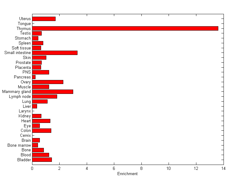The expression level is normalized with tissue-library size. Each value for a gene in a tissue is a ratio of observed ESTs to the expected one in this tissue. The expected number of ESTs is the product of total ESTs of the gene and the fraction of total ESTs in the tissue among all ESTs in 30 tissues.