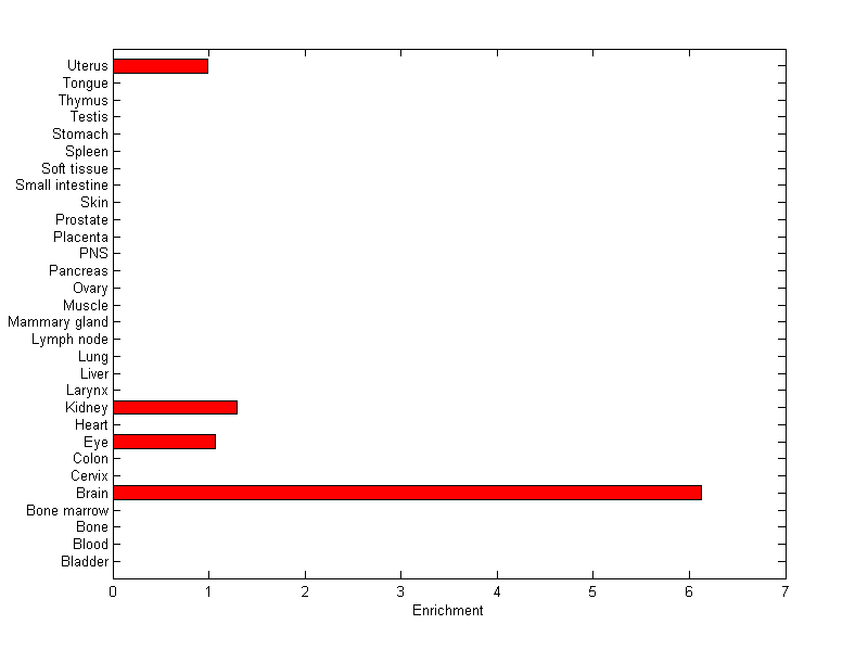 The expression level is normalized with tissue-library size. Each value for a gene in a tissue is a ratio of observed ESTs to the expected one in this tissue. The expected number of ESTs is the product of total ESTs of the gene and the fraction of total ESTs in the tissue among all ESTs in 30 tissues.