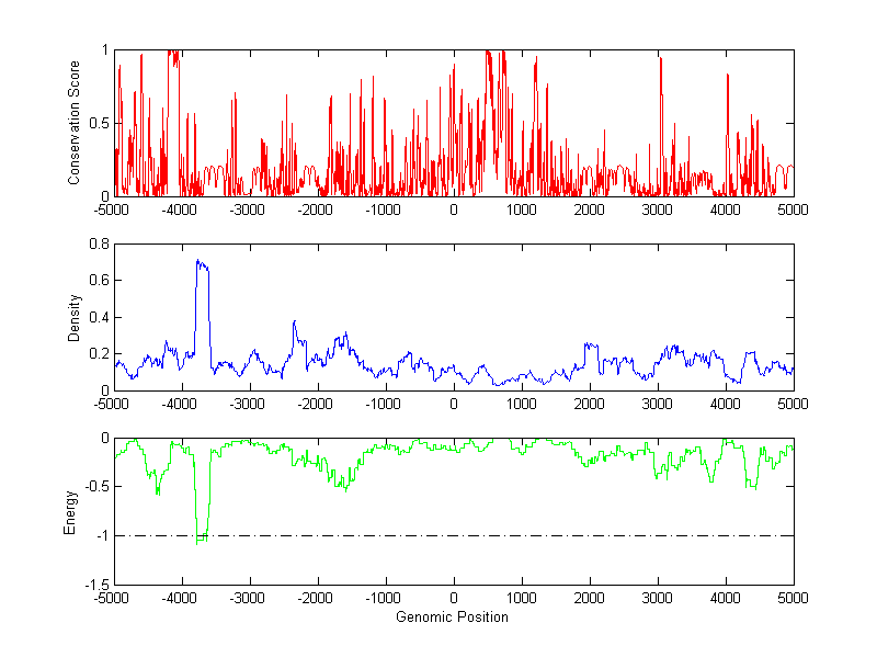The energy profile (green curve) is about energy for module detection based on TF interaction. The positions with energy less than -1 indicate the existence of CRMs.