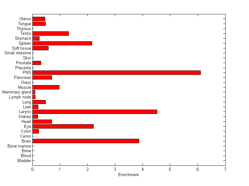 The expression level is normalized with tissue-library size. Each value for a gene in a tissue is a ratio of observed ESTs to the expected one in this tissue. The expected number of ESTs is the product of total ESTs of the gene and the fraction of total ESTs in the tissue among all ESTs in 30 tissues.