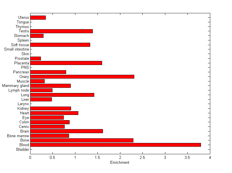 The expression level is normalized with tissue-library size. Each value for a gene in a tissue is a ratio of observed ESTs to the expected one in this tissue. The expected number of ESTs is the product of total ESTs of the gene and the fraction of total ESTs in the tissue among all ESTs in 30 tissues.