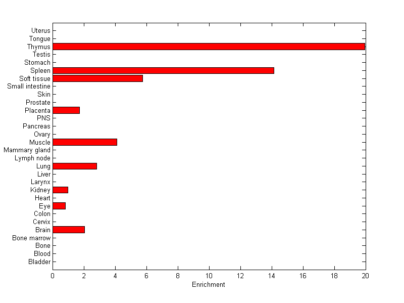 The expression level is normalized with tissue-library size. Each value for a gene in a tissue is a ratio of observed ESTs to the expected one in this tissue. The expected number of ESTs is the product of total ESTs of the gene and the fraction of total ESTs in the tissue among all ESTs in 30 tissues.