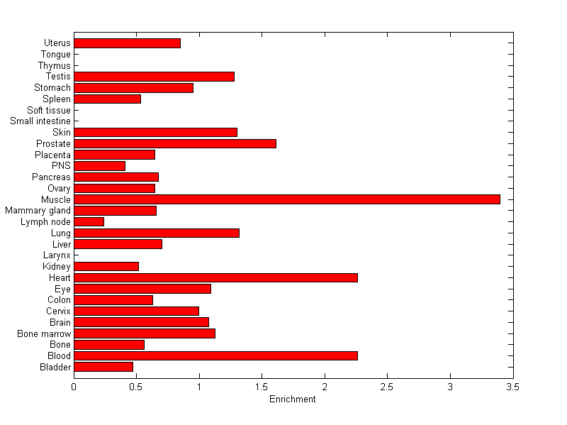 The expression level is normalized with tissue-library size. Each value for a gene in a tissue is a ratio of observed ESTs to the expected one in this tissue. The expected number of ESTs is the product of total ESTs of the gene and the fraction of total ESTs in the tissue among all ESTs in 30 tissues.