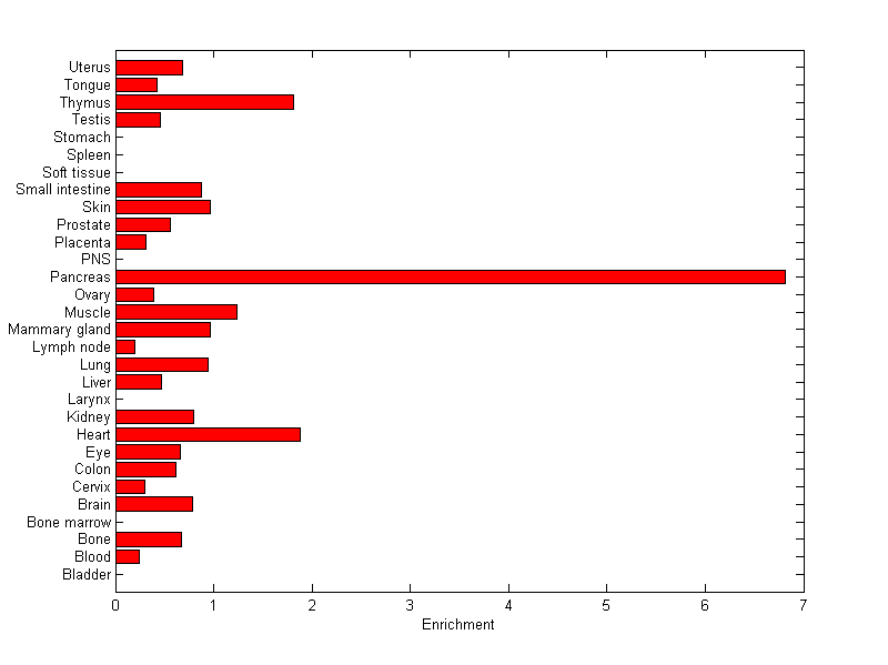 The expression level is normalized with tissue-library size. Each value for a gene in a tissue is a ratio of observed ESTs to the expected one in this tissue. The expected number of ESTs is the product of total ESTs of the gene and the fraction of total ESTs in the tissue among all ESTs in 30 tissues.