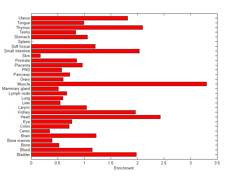 The expression level is normalized with tissue-library size. Each value for a gene in a tissue is a ratio of observed ESTs to the expected one in this tissue. The expected number of ESTs is the product of total ESTs of the gene and the fraction of total ESTs in the tissue among all ESTs in 30 tissues.