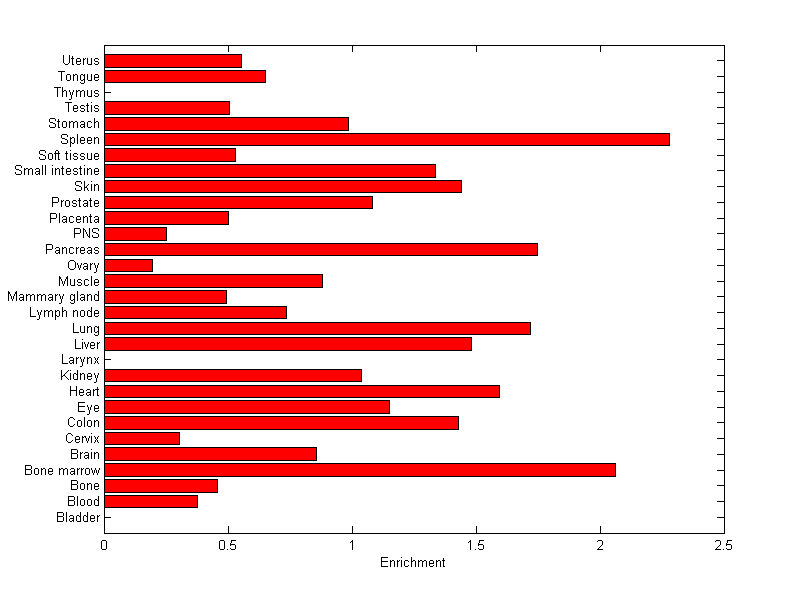 The expression level is normalized with tissue-library size. Each value for a gene in a tissue is a ratio of observed ESTs to the expected one in this tissue. The expected number of ESTs is the product of total ESTs of the gene and the fraction of total ESTs in the tissue among all ESTs in 30 tissues.
