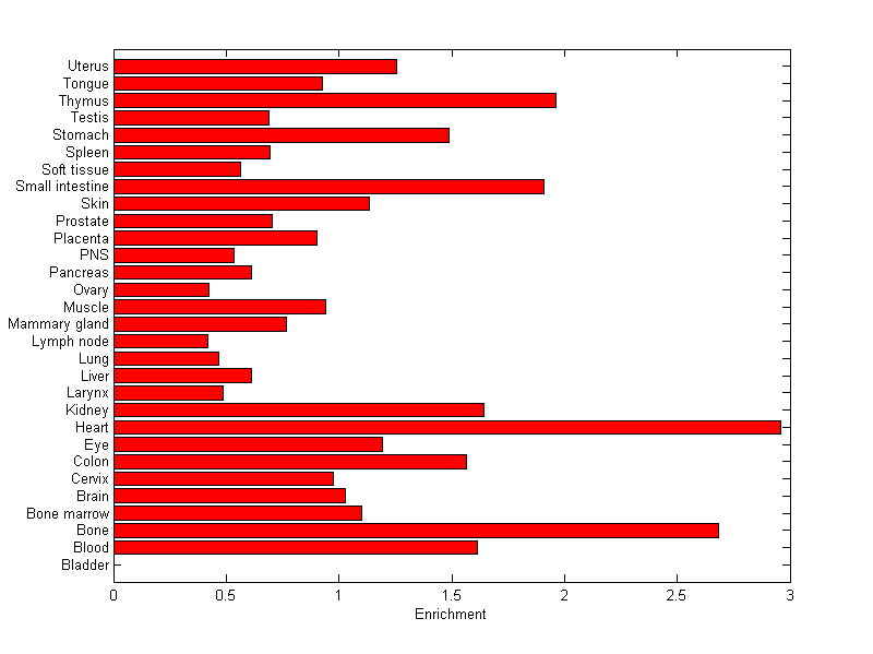 The expression level is normalized with tissue-library size. Each value for a gene in a tissue is a ratio of observed ESTs to the expected one in this tissue. The expected number of ESTs is the product of total ESTs of the gene and the fraction of total ESTs in the tissue among all ESTs in 30 tissues.