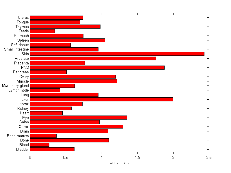 The expression level is normalized with tissue-library size. Each value for a gene in a tissue is a ratio of observed ESTs to the expected one in this tissue. The expected number of ESTs is the product of total ESTs of the gene and the fraction of total ESTs in the tissue among all ESTs in 30 tissues.