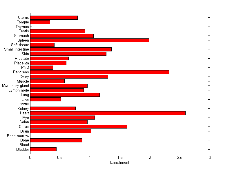 The expression level is normalized with tissue-library size. Each value for a gene in a tissue is a ratio of observed ESTs to the expected one in this tissue. The expected number of ESTs is the product of total ESTs of the gene and the fraction of total ESTs in the tissue among all ESTs in 30 tissues.