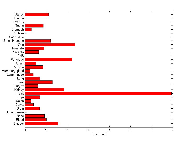 The expression level is normalized with tissue-library size. Each value for a gene in a tissue is a ratio of observed ESTs to the expected one in this tissue. The expected number of ESTs is the product of total ESTs of the gene and the fraction of total ESTs in the tissue among all ESTs in 30 tissues.