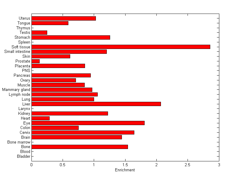 The expression level is normalized with tissue-library size. Each value for a gene in a tissue is a ratio of observed ESTs to the expected one in this tissue. The expected number of ESTs is the product of total ESTs of the gene and the fraction of total ESTs in the tissue among all ESTs in 30 tissues.
