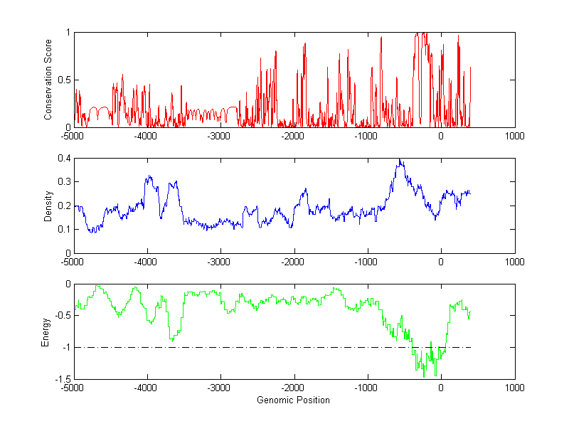 The conservation profile (red curve) is about conservation scores of the promoter sequences. Conservation was determined from an eight-way alignment of human, chimpanzee, dog, mouse, rat, chicken, zebrafish and fugu sequences. The conservation was quantified by a conservation score between 0 and 1, with 1 as highest conservation. The conservation score was obtained from UCSC genome databases.