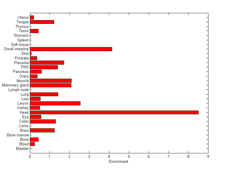The expression level is normalized with tissue-library size. Each value for a gene in a tissue is a ratio of observed ESTs to the expected one in this tissue. The expected number of ESTs is the product of total ESTs of the gene and the fraction of total ESTs in the tissue among all ESTs in 30 tissues.