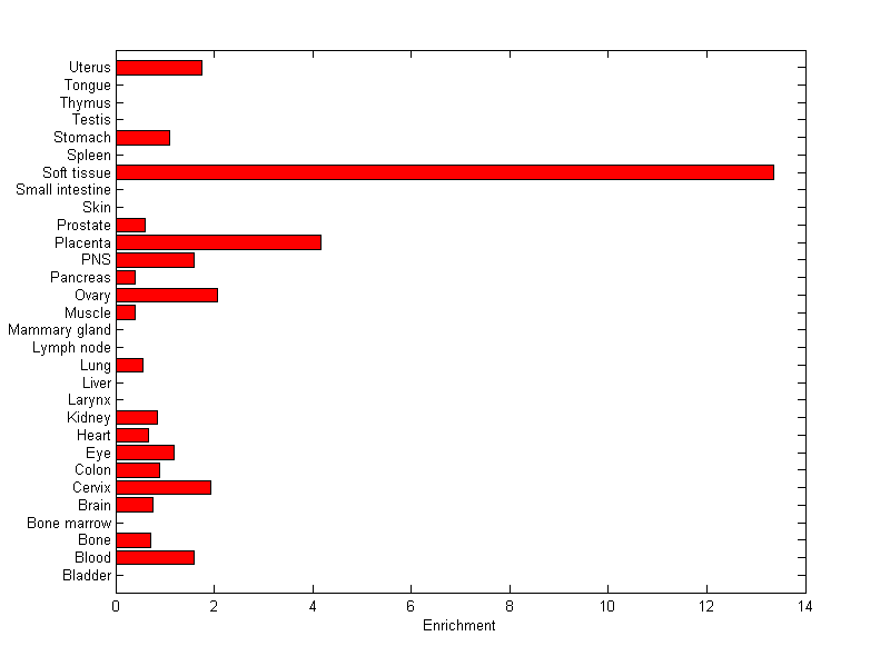 The expression level is normalized with tissue-library size. Each value for a gene in a tissue is a ratio of observed ESTs to the expected one in this tissue. The expected number of ESTs is the product of total ESTs of the gene and the fraction of total ESTs in the tissue among all ESTs in 30 tissues.