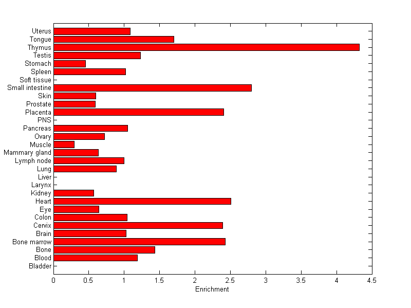 The expression level is normalized with tissue-library size. Each value for a gene in a tissue is a ratio of observed ESTs to the expected one in this tissue. The expected number of ESTs is the product of total ESTs of the gene and the fraction of total ESTs in the tissue among all ESTs in 30 tissues.